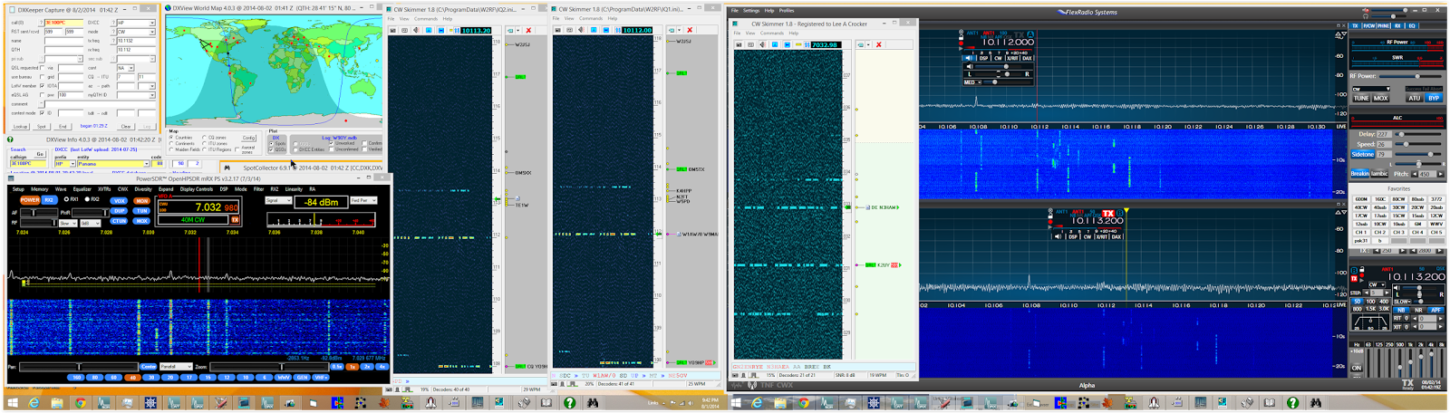 This is a pic of my Flex 6300 running 2 slices with 2 CW skimmers (the ones on 30M) looking at the W1AW/0 pileup. In the shot is the DXLab suite including Commander DX Keeper DXview plus World Map and spot collector. Also DDUTIL_v3 and SDRMemory6K SmartDAX SmartCAT and SSDR.